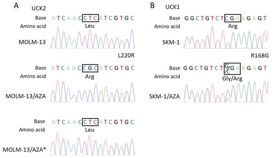 Results of the RT–PCR product sequence analysis of (A) the UCK2 coding region in the MOLM-13 parental cell line and its AZA-resistant sublines showing the homozygous mutation site present in the MOLM-13/AZA cell variant but absent in the MOLM-13/AZA* variant. (B) UCK1 coding region in the SKM-1 parental cell line and AZA-resistant subline SKM-1/AZA showing the heterozygous mutation site.