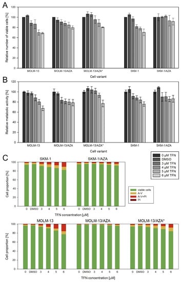 Impact of TFN on AZA-sensitive and AZA-resistant cell variants after 72 h of cultivation. TFN was added to the culture medium every 24 h at four concentrations (3, 4, 5, and 6 μM). Bars for DMSO represent the cells treated with the highest concentration of DMSO present during TFN treatment. (A) Relative number of viable cells after TFN treatment compared to untreated controls as measured by CASY TT. (B) Relative metabolic activity of cells after TFN treatment as measured by MTS assay. (C) Proportions of viable (unstained), apoptotic (stained with Annexin-V or both Annexin-V and PI), and necrotic (stained by PI) cells.