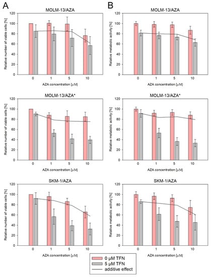 Impact of TFN and AZA cotreatment on AZA-resistant cells after 72 h of cultivation. AZA was added at 1, 5, and 10 μM concentrations to the cells in the presence (gray bars) or absence (pink bars) of 5 μM TFN. Both drugs were added to the culture medium every 24 h. The gray line represents the calculated additive effect of the two drugs. If there is synergy between the drugs, the pink bars should be below the grey line. In the case of a non-synergistic effect, pink bars could appear either above the grey line in the case of an antagonistic effect, or close to the grey line in the case of an interdependent effect of the drugs. (A) Relative number of viable cells after AZA and TFN combined treatment compared to cells treated by only one of the drugs as measured by CASY TT. (B) Relative metabolic activity of cells after AZA and TFN combined treatment compared to cells treated by only one of the drugs as measured by MTS assay.