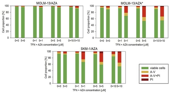 Proportions of viable (unstained), apoptotic (stained with Annexin-V or both Annexin-V and PI), and necrotic (stained by PI) cells after TFN and AZA combined treatment of AZA-resistant cells after 72 h cultivation compared to cells treated by only one of the drugs. AZA was added at concentrations of 1, 5, and 10 μM to the cell culture medium with or without 5 μM TFN. Both drugs were added to the culture medium every 24 h.