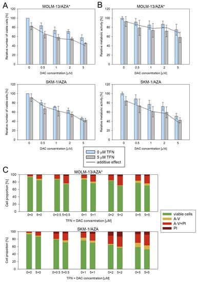 Impact of TFN and DAC combined treatment on AZA-resistant cells after 72 h of cultivation. DAC was added at 0.5, 1, 2, and 5 μM concentrations to the cells in the presence (gray bars) or absence (blue bars) of 5 μM TFN. Both drugs were added to the culture medium every 24 h. The gray line represents the calculated additive effect of the two drugs. If there is synergy between the drugs, the blue bars should be below the grey line. In the case of a non-synergistic effect, blue bars could appear either above the grey line in the case of an antagonistic effect, or close to the grey line in the case of an interdependent effect of the drugs. (A) Relative number of viable cells after DAC and TFN combined treatment compared to cells treated by only one of the drugs as measured by CASY TT. (B) Relative metabolic activity of cells after DAC and TFN combined treatment compared to cells treated by only one of the drugs as measured by MTS assay. (C) Proportion of viable (unstained), apoptotic (stained with Annexin-V or both Annexin-V and PI), and necrotic (stained by PI) cells after DAC and TFN combined treatment compared to cells treated by only one of the drugs.