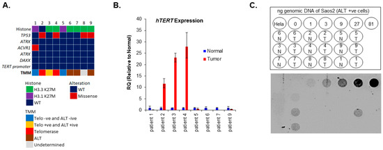 TMM in pHGG. (A) Graphical summary of gene mutation status and associated TMM in our DIPG cohort. Each column represents one patient. (B) Evaluation of hTERT expression by qPCR. Error bars represent the standard error of the mean from two different experiments run in triplicates. Due to a limited amount of tissue sample, patient 8 is not shown. (C) Dot blot of the C-Circle assay to evaluate ALT activity. Serial dilutions of Saos2 were used as a positive for ALT control and HeLa cells were used as negative control for ALT. N = normal, T = tumor.