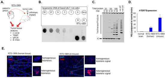 RTS-1969 tumor shows characteristics of both Telomerase and ALT phenotype. (A) Schematic illustration of in vivo orthotopic tumor transplant in mouse. (B) Dot blot of the C-Circle assay to evaluate ALT activity. Serial dilutions of Saos2 were used as a positive control for ALT and HeLa cells were used as negative control for ALT. (C) TRAP assay showing telomerase activity in RTS-1969 from patient tumor (H) as well as in mouse xenograft (M). (D) Evaluation of hTERT expression by qPCR. Error bars represent the standard error of the mean from two different experiments run in triplicates. (E) IF-FISH images to assess intensity of telomere signal in tumor and non-tumor regions of the brain from GBM patient and mouse xenograft tissue.