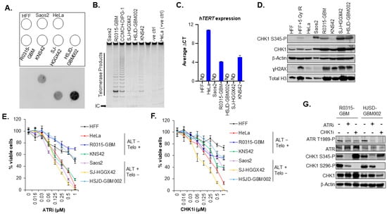 It has previously been shown that cancer cell lines including osteosarcoma, lung cancer and glioma stem cell lines that rely on the ALT pathway were hypersensitive to the inhibition of the protein kinase ataxia telangiectasia- and RAD3-related protein (ATR) [41]. However, later studies could not confirm a general ATR inhibitor sensitivity of ALT-positive cells [42,43]. Given these findings, we evaluated the sensitivity to ATR inhibitor and ATR downstream target CHK1 inhibitor in our panel of pediatric GBM cell lines. First, we assessed the telomerase and hTERT expression using TRAP assay and qPCR respectively. ALT activity was assessed using the C-Circle assay (Figure 3A–C). Two cell lines, SJ-HGG42 and HSJD-GBM002, harboring the H3.3G34R mutation were ALT positive, while KNS42 and R0315-GBM cell lines were telomerase positive and were H3.3G34V mutant and H3.3 WT, respectively (Figure 3A–C). Saos-2 cells and HeLa were used as positive controls for ALT and telomerase activity, respectively. HFF cells were used as normal diploid primary human cells and hTERT expression negative control. Next, we explored the correlation between the sensitivity to the inhibitors of the DNA damage pathway (ATR and CHK1 inhibitors) and ALT status in our cell lines. We first evaluated the status of the ATR pathway (Figure 3D and Figure S1A,B). Our results indicate that the sensitivity to ATR inhibition is not specific to ALT cells compared to cells using telomerase. (Figure 3E and Figure S1C). Furthermore, CHK1, a downstream target of ATR, has previously been shown to be the kinase for H3.3 S31 phosphorylation required for chromatin integrity and cell survival of ALT cells [44]. Like ATR inhibition, the sensitivity to CHK1 inhibition was not specific to ALT-positive cells (HJSD-GBM002) compared to telomerase-positive cells (Figure 3F and Figure S1C). Moreover, it has been shown that H3.3 S31 phosphorylation levels are elevated in ALT cells compared to telomerase-positive cells, and more importantly, there is an aberrant localization and spreading of H3.3 S31 phosphorylation along the chromosome arms during mitosis in ALT cells [44]. However, in our GBM cell lines, aberrant staining and localization of H3.3 S31 phosphorylation along the chromosome arms was not specific to ALT but present in both ALT-positive HSJD-GBM002 cells and telomerase-positive R0315-GBM cells (Figure S2), suggesting that H3.3 S31 phosphorylation is not specifically required for pHGG ALT cells survival. Together, these data suggest that the ATR-CHK1 pathway is not a specific determinant of ALT phenotype in pediatric GBM.