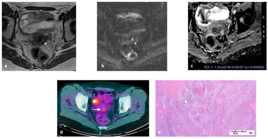 MRI and 18F-FDG-PET/CT images at “final” examination of a 50-year-old woman with locally advanced cervical cancer. Transaxial MRI showed a small residual hyperintense area within the cervix on T2-WI ((a), arrow) with evidence of high signal intensity on DWI ((b), arrow) and an ADCmean value ≤ 1.1 × 10−3 mm2/s (c). Transaxial PET/CT image showed an area of focal uptake within the cervix with SUVmax 3.3 ((d), arrow); the area of focal intense uptake is due to bladder activity. Applying the formula reported in the text, the probability (yt) of this patient having a partial pathological response was 71.4%. Histopathology showed macroscopic residual disease (e).