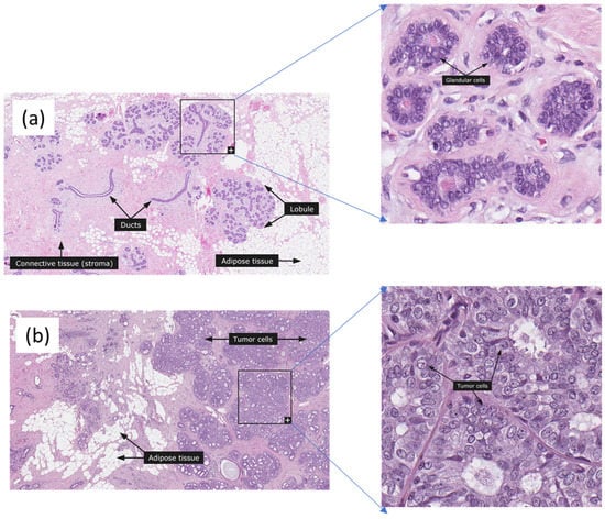 Normal and ductal carcinoma breast histopathology images from the Huma Protein Atlas Tumor cells, adipose tissue, and glandular cells are marked. (a) Normal, (b) Ductal Carcinoma, 68 years old female, Elston-Ellis score is 4. The images were used with the permission of The Human Protein Atlas; this work met their conditions for the use of the above images.