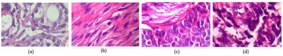 Breast cancer histopathology images from the BreakHis 400× image dataset. The images in (a,b) are classified as benign, and the images shown in (c,d) are classified as malignant by pathologists.