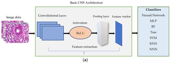 In this paper, we used three approaches to extract the features from the images: (1) a basic CNN architecture, (2) transfer learning, VGG16, and (3) a knowledge-based approach. CNN and transfer learning approaches extract the feature automatically. The origin of the features is not known. Whereas the knowledge-based approach has mathematically defined features, which were driven by expert input. Seven supervised classifiers—Neural Network, Multilayer Perceptron, Random Forest, Decision Tree, SVM, KNN, and NNN- were trained using the feature sets, and their performances were evaluated and compared. Knowledge-based features were obtained from [9], and the details were presented in Section 4.3.
