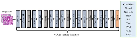 The VGG16 [25] model consists of 16 layers of convolutional and pooling operations and has been widely used for image classification tasks. It is characterized by using small 3 × 3 filters throughout the network, which leads to a deeper network with smaller receptive fields. We extracted features from the images using the VGG16 CNN model, which was trained on the ImageNet dataset [28]. First, the pre-trained VGG16 model was loaded and did not include the top layers, as these were the layers responsible for the final classification. Then, a new model was created, which took the output of the last layers of VGG16 as input. Next, the preprocessed BreakHis image dataset was fed to the model to extract the features from the images. These extracted features were then fed to the classifiers. Figure 4 illustrates the transfer learning-based feature extraction steps.