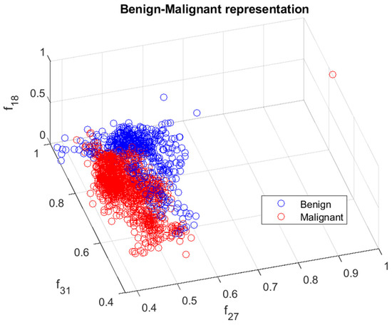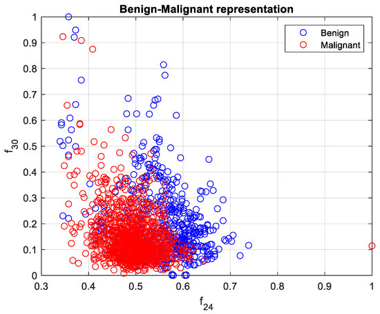 Benign and malignant characterization by directional features and intensity-based feature . Benign and malignant cases are represented in blue and red, respectively.