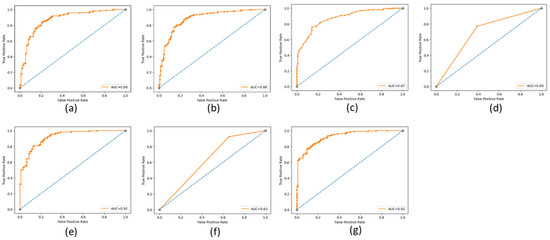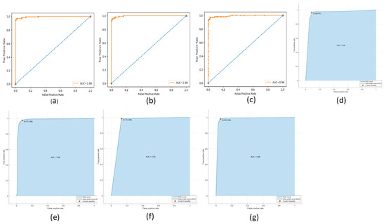 ROC and AUC graphical representations of the CNN feature extraction approach using the classifiers. (a) NN (64 units), (b) MLP, (c) RF, (d) Decision tree, (e) SVM, (f) KNN, and (g) NNN (10 units).