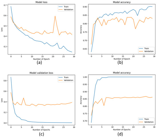 Model loss and accuracy performance for training and validation data. (a,b) CNN (c,d) VGG16.