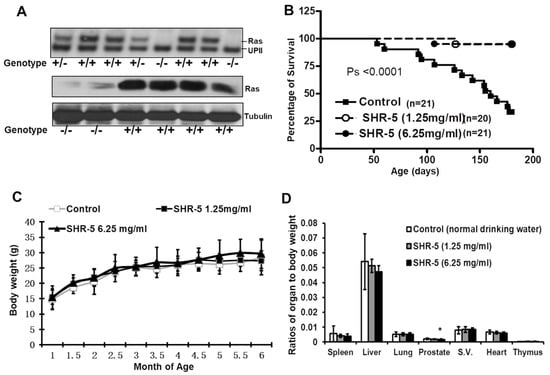 3.1. SHR-5 Drinking Extends the Life of Male Homozygous UPII-Mutant Ha-Ras Transgenic Mice