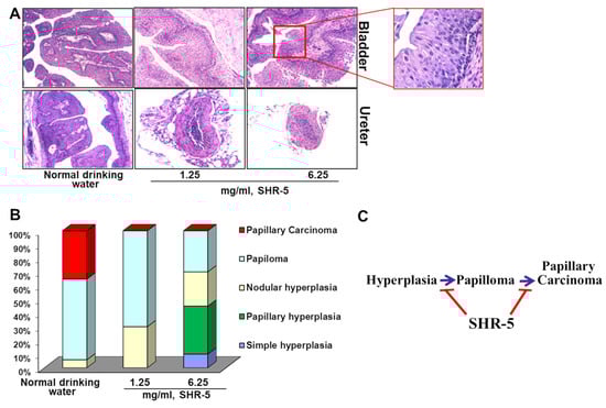 3.3. SHR-5 Drinking Blocks the Progression to Papillary Carcinoma in the UPII-Mutant Ha-Ras Mice