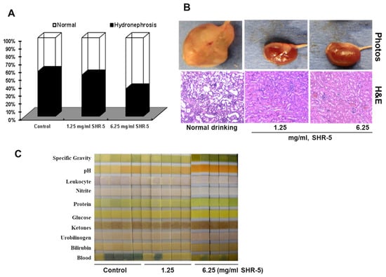 3.4. SHR-5 Drinking Improves Hematuria and Obstructive Uropathy in the UPII-Mutant Ha-Ras Mice