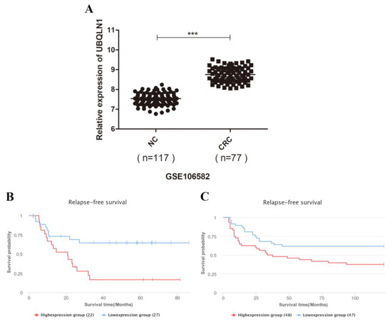 We used the lnCAR database (https://lncar.renlab.org/, accessed on 7 August 2020) to access prognosis data for those colorectal patients with high levels of UBQLN1 expression. Prognostic values, including two relapse-free survival (RFS) values of UBQLN1 mRNA expression, respectively, in colon cancer samples and colorectal cancer tissues, were estimated. We found that the mRNA expression level of UBQLN1 was negatively correlated with RFS in colon cancer (Figure 1B; analysis ID: CR_O19, p = 0.0056) and colorectal cancer (Figure 1C; analysis ID: CR_O16, p = 0.0172).