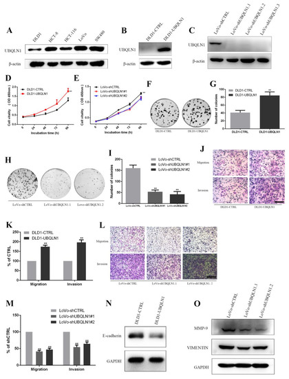 To ascertain whether over-expression/knockdown of UBQLN1 would influence cell epithelial–mesenchymal transition (EMT) capacities, a transwell migration and invasion assay were performed. Over-expression of UBQLN1 increased the numbers of migrated and invaded cells through the bottom of the transwell with or without matrigel (Figure 2J,K). In contrast, the knockdown of UBQLN1 decreased migrated and invaded cells’ numbers (Figure 2L,M). Meanwhile, Western blot assay was used to detect EMT marker E-cadherin, VIMENTIN, and MMP-9. The protein level of E-cadherin was reduced in DLD1-UBQLN1 cells compared with the control level (Figure 2N), and the protein level of VIMENTIN and MMP-9 was reduced in LoVo-shUBQLN1 cells compared with the control level (Figure 2O), suggesting that UBQLN1 may also enhance CRC cells’ EMT.