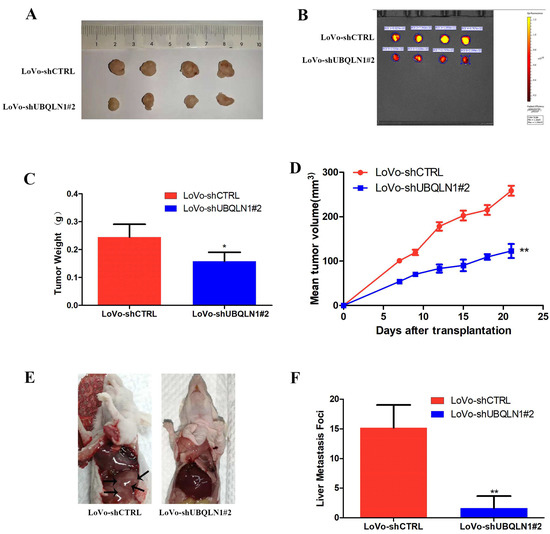 Reduced UBQLN1 inhibited CRC cells’ tumorigenesis and metastasis in vivo. (A,B) Nude mice were subcutaneously injected with UBQLN1 silencing cell line LoVo and its control cells. The transplanted tumors were dissected out. (C) tumors’ weights were measured after dissection. (D) tumors’ volumes were measured during growth process. (E,F) nude mice were injected with UBQLN1 silencing cell line LoVo and its control cells through tail vein to establish distant metastasis model. The nude mice were sacrificed by anesthesia, and their liver metastasis was observed. Results were displayed as figures (E) and statistical graph (F). Data are shown as mean ± SD; n = 3 independent experiments; and * p < 0.0.5, ** p < 0.01 based on Student’s t-test.