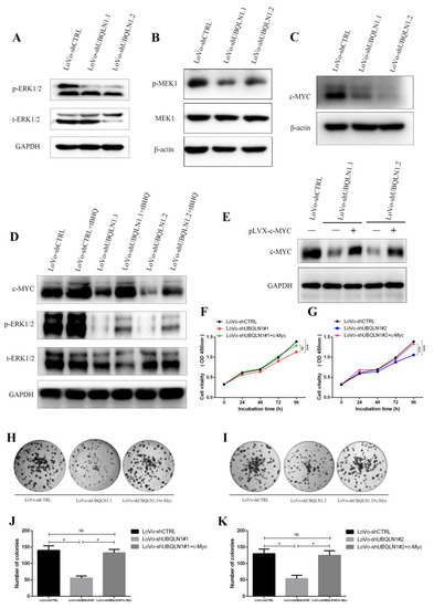 To specify whether UBQLN1 loss inhibited CRC cells’ progression through the ERK-c-Myc signaling pathway, we overexpressed c-Myc in UBQLN1-deficient CRC cells (Figure 4E). The CCK-8 and colony formation assay showed LoVo cells’ abilities of proliferation and colony forming were restored to normal levels upon elevation of c-Myc in UBQLN1-deficient cells, establishing a strong connection between UBQLN1 and c-Myc (Figure 4F–K). We also confirmed the correlation between knockdown of UBQLN1 and ERK-c-Myc pathway in SW480 (Figure S1). These results confirmed that c-Myc is the downstream target of UBQLN1 that mediates proliferation by UBQLN1 loss. Above all, the knockdown of UBQLN1 inhibited CRC cells’ malignant progression through the ERK-c-Myc signaling pathway.