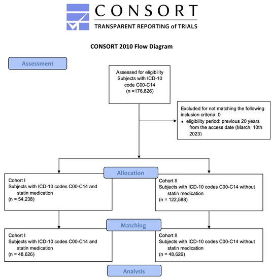 The TriNetX Global Health Research Network provides access to medical records from more than 80 healthcare organizations (HCOs) in 30 countries, enabling the collection and exchange of longitudinal clinical data between contract research institutes and pharmaceutical companies. At the time of data acquisition, electronic medical records of more than 250 million individuals were collected and available for statistical analysis, as implemented in previous studies [29,30]. The TriNetX database was searched for individuals who were diagnosed with HNC (International Classification of Diseases (ICD)-10 codes C00–C14 5 to 20 years before the access date (27 January 2023)). To be included, patients’ medical records had to cover at least five years (1825 days) of follow-up after visiting the HCO for an inpatient encounter. Medical records older than 20 years were not included. Patients with statin medication were assigned to cohort I (subjects with ICD-10 codes C00–C14 and medication of Rosuvastatin, Simvastatin, Fluvastatin, Pravastatin, Lovastatin, Atorvastatin, and Pitavastatin). Further, cohort II was formed of subjects who were diagnosed with ICD-10 codes C00–C14 and no history of statin medication. As in previous studies, one-to-one matching was performed for age, gender, and tobacco and/or alcohol abuse (ICD-10: Z87.891, F10.1, or F10.2) to receive randomized conditions as closely as possible by obtaining cohorts with similar covariate distributions [29,30].