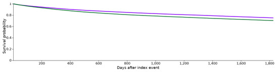 Kaplan–Meier survival curves for both cohorts. Cohort I (ICD-10 codes C00-C14 and statin medication; purple) and cohort II (ICD-10 codes C00-C14 without statin medication; green).