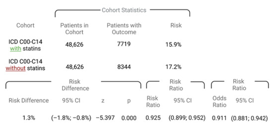 Additionally, our data support the results of various in vitro studies on the effect of statins on HNSCC cells [21,22,47] and allow translation into a clinical context. However, the obtained results need to be cautiously interpreted, as limitations of this study exist. Specifically, the TriNetX database was used to search for subjects with diagnoses (ICD-10 codes C00–C14), which presupposes the correct classification of the malignant neoplasia in the head and neck. Moreover, patients suffering from different subtypes, or even rare entities of HNC might be included in this study, leading to a certain risk of confounder bias. Furthermore, staging following the Union for International Cancer Control (UICC), clinical, histological, and molecular features, as well as the applied therapy have not been considered, despite the well-known influence on the probability of patients’ survival [48,49,50,51,52]. Statins were regarded as one group, despite different potencies and dosages. Information about the duration of statin therapy was not available but in general, statins are administered on a long-term basis. Even though one-to-one matching was performed, a certain risk of confounder bias remained since no detailed data on tobacco use (total pack years), alcohol abuse (consumed alcohol units), race [53], secondary diagnosis [54,55], and HPV status [56,57] were available.