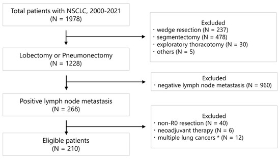 A total of 1978 patients with NSCLC underwent surgery between January 2000 and December 2021 at Niigata University Medical and Dental Hospital. We retrospectively reviewed 210 consecutive patients who underwent lobectomy or pneumonectomy and had pathological lymph node metastases. Patients who underwent non-R0 resection and neoadjuvant therapy, had multiple lung cancers defined as synchronous cancers, or had a previous treatment history for lung cancer were excluded from the analysis (Figure 1).