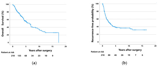 (a) Overall survival curves and (b) recurrence-free probability curves of the 210 patients with pathological lymph node metastases who were surgically treated with lobectomy or pneumonectomy.