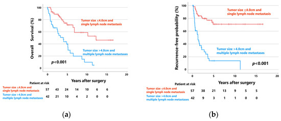Patients with tumors ≤ 4.0 cm and single lymph node metastases (n = 57) showed significantly better OS and RFP than those with tumors > 4.0 cm and multiple lymph node metastases (n = 42) (Figure 3). The 5-year OS rates of patients with tumors ≤ 4.0 cm and single lymph node metastases and those with tumors > 4.0 cm and multiple lymph node metastases were 71.4% (median follow-up: 55 months) and 39.7% (median follow-up: 28 months), respectively (p < 0.001). The 5-year RFPs of these groups were 70.9% (median follow-up: 46 months) and 13.8% (median follow-up: 11 months), respectively (p < 0.001).