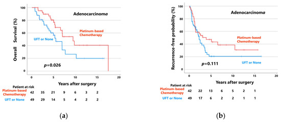 Figure 4 shows the OS (a) and RFP (b) curves of patients with adenocarcinoma (n = 91) who received postoperative platinum-based adjuvant chemotherapy (n = 42) and those who received UFT or did not receive adjuvant chemotherapy (n = 49). Patients who received postoperative platinum-based adjuvant chemotherapy (median follow-up: 61 months) showed significantly better OS than those who did not (median follow-up: 40 months). The 5-year OS rates of the patients with adenocarcinoma who did and did not receive postoperative platinum-based adjuvant chemotherapy were 76.8% and 56.6%, respectively (p = 0.026). Moreover, patients who received postoperative platinum-based adjuvant chemotherapy (median follow-up: 31 months) tended to have better RFPs than those who did not (median follow-up: 22 months). The 5-year RFPs of these groups were 47.4% and 20.7%, respectively (p = 0.111).
