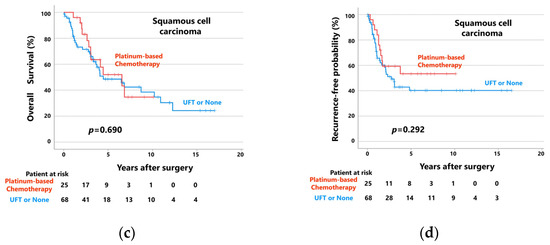 (a) Overall survival curves and (b) recurrence-free probability curves of patients with adenocarcinoma, patients who received platinum-based chemotherapy, and patients who received UFT or did not receive adjuvant chemotherapy. (c) Overall survival curves and (d) recurrence-free probability curves of patients with squamous cell carcinoma, patients who received platinum-based chemotherapy, and patients who received UFT or did not receive adjuvant chemotherapy.