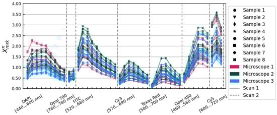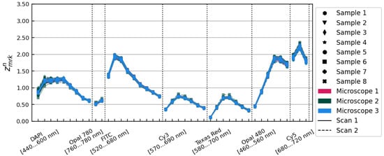 The spectra are pictured in Figure 1, showing an initial variation in overall illumination and relative spectral intensity characterized by a standard deviation of 29.85% on average over all image layers. We used these spectra to develop a method of accounting for those differences, independently modelling contributions from the individual tissue samples themselves and from the three different microscopes.