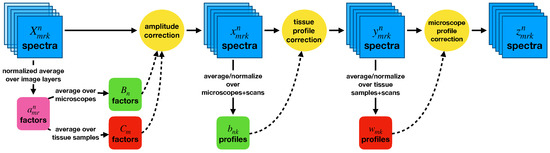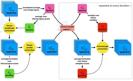 A diagram of the procedure used to correct the entire dataset. Overall amplitude corrections are applied first, then wavelength-dependent profile corrections. Contributions from the tissue samples on the slides and from the microscopes used are treated independently.