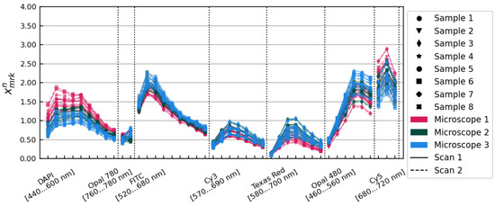 spectra showing average tissue flux relative to the overall mean for each scan of each sample on each microscope. Data from different microscopes are plotted in different colours. Solid and dashed lines show data from scans 1 and 2, respectively. Individual tissue samples are distinguished with different marker styles, as shown in the legend.