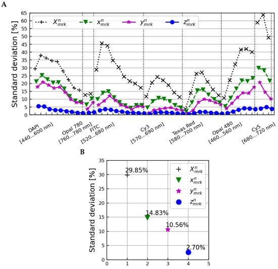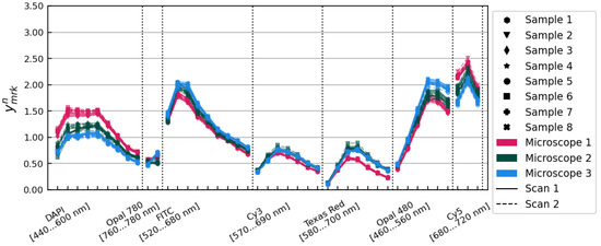 The three sets of unmixed images were multiplied by their binary image masks and their average brightnesses in each layer were calculated and normalized as in Equations (1)–(4) above, except that the number of image layers was instead of . Tissue sample-specific normalization factors and were calculated as in Equations (6) and (14), respectively, and applied as in Equation (15). The resulting three sets of spectra, one for each unmixing method, are shown in Figure S7 (the autofluorescence layer is omitted). The standard deviations across all samples, microscopes, and scans of these spectra are shown in Figure 10, along with their averages over all but the autofluorescence layer.