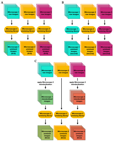Flowcharts describing the three unmixing methods used to evaluate the impact of microscope standardization on measurements of marker expressions: (A) unmixing raw images with the reference microscope library, (B) unmixing raw images with microscope-specific libraries, and (C) unmixing corrected images with the reference microscope library.