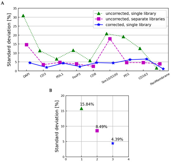 The standard deviation across all samples, microscopes, and scans as a function of the image layer (A) and averaged over all image layers (B) for the spectra derived from uncorrected images unmixed with the single set of microscope 2 libraries (dotted line), uncorrected images unmixed using microscope-specific libraries (dashed line), and corrected images unmixed using the microscope 2 libraries (solid line). The autofluorescence layer is omitted in (A) and not used to calculate the values in (B).