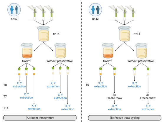 Experimental set-up to evaluate UAS™ preservative performance under different storage conditions—Sample collection and pooling were done similarly for the room temperature experiment (A) or the freeze-thaw experiment (B); urine samples were obtained from 21 females and 21 males using Colli-Pee® FV-5040 (Novosanis) without preservative. After collection, three female or male samples were combined to form female pooled (FP) or male pooled (MP) urine samples, respectively. A total of 14 (7 FP and 7 MP) pooled urine samples were generated and used for the experiment. Abbreviations: no addition, neat; T0, day 0 or baseline; T7, 7 days; T14, 14 days; X, cell-free total nucleic acid extraction; Y, cellular pellet extraction. Created with BioRender.com.