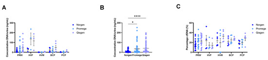 The DNA concentration of the different samples ranged from 0.00 ng DNA/mL urine to 236.53 ng DNA/mL urine without statistically significant differences (Figure 5A); however, lower averages were found for the male samples (2.30 ± 2.33 ng DNA/mL urine for healthy male volunteers and 4.63 ± 3.66 ng DNA/mL urine for prostate cancer patients) compared to the female samples (98.43 ± 58.05 ng DNA/mL urine for healthy female volunteers, 33.28 ± 19.02 ng DNA/mL urine for pregnant women, and 31.04 ± 15.87 ng DNA/mL urine for breast cancer patients). Statistically significant differences were demonstrated between the Norgen isolation kit and the Promega (p < 0.03) and Qiagen (p < 0.0001) isolation kits, indicating that a higher amount of DNA per start volume of urine was obtained using the Promega and Qiagen isolation kits (Figure 5B). It is important to note that for Norgen, the starting volume of urine was higher, allowing fewer isolations to obtain more DNA. Furthermore, the cfDNA percentage of all participant types averaged around 20%, with no statistically significant differences between the participant types (Figure 5C). Additionally, no profound differences in sample DNA profiles were found between the urine samples of all different participant types or the isolation methods (Figure S1). Overall, these results suggest that all three commercially available isolation methods performed comparably based on DNA profiles and cfDNA percentages for the isolation of urinary cfDNA. Additionally, the UAS™ preservative is extraction-agnostic given its compatibility with three isolation methods based on different mechanisms.
