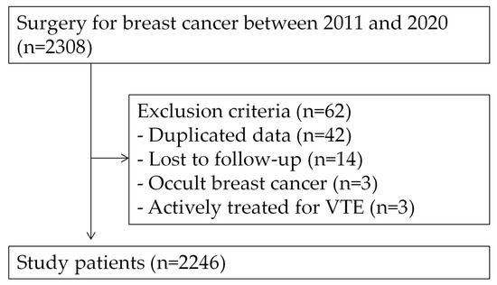 Data were collected from a retrospective database of patients who underwent breast cancer surgery at a single tertiary institution between January 2011 and December 2020. Consecutive patients diagnosed with breast cancer during this period were included. Exclusion criteria were patients who refused breast surgery, those with occult breast cancer, ongoing treatment for VTE, and a follow-up period of <1 month. Further, clinicopathological, radiological, and survival data were obtained.