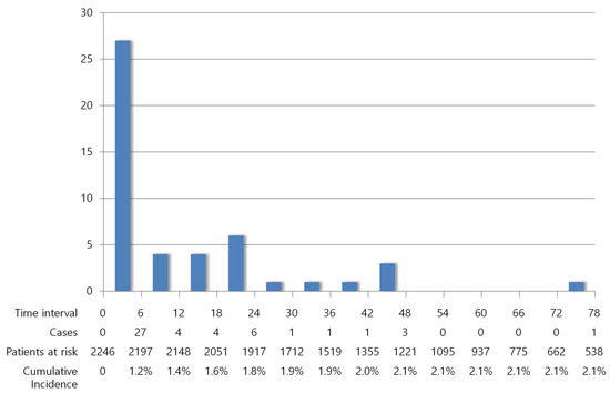 The occurrence of VTE was analyzed as a time-dependent variable. Forty-eight (2.1%) patients developed VTE during a median follow-up of 53 months (range, 0–140 months). The incidence of VTE was 459 cases per 100,000 person-years, on average. Among the 48 patients with VTE, 27 (56.3%) were diagnosed within 6 months of breast cancer diagnosis, 31 (64.6%) were diagnosed within 12 months, and 41 (85.4%) were diagnosed within 24 months (Figure 2). The incidences of VTE during the initial 6 months, 12 months, and 24 months of diagnosis were 2433, 1456, and 990 cases per 100,000 person-years, respectively. Median VTE-free survival was 4.5 months (range, 0–73 months).
