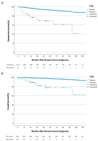 Disease-free survival was defined as the time interval between curative surgery for primary breast cancer and recurrence, overall survival was defined as the time interval between breast cancer diagnosis and in-hospital mortality or hospice discharge, and the VTE-free interval was defined as the time interval between breast cancer diagnosis and occurrence of VTE.