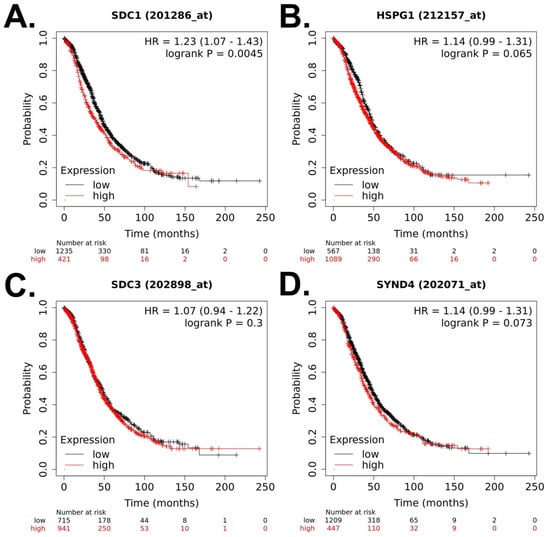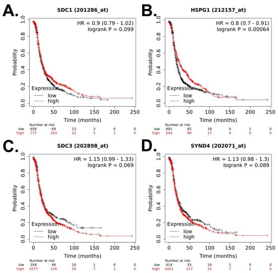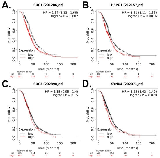 Prognostic value of syndecan family members expression for overall survival of patients with ovarian cancer based on the dataset of the Kaplan–Meier plotter [29] (data retrieved on 15 March 2023). The default settings in the KM Plotter tool were used to calculate the overall survival. (A) SDC1 (syndecan-1), (B) SDC2 (HSPG1, syndecan-2), (C) SDC3 (syndecan-3), (D) SDC4 (syndecan-4).