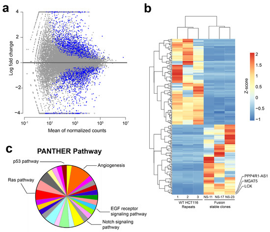 Transcriptome analysis of monoclonal NAB2exon6–STAT6exon17 fusion cells with their control HCT116 cells. (a) MA-plot analysis of monoclonal fusion cells vs. control HCT116 cells displaying differentially expressed (blue) genes (adjusted p-values < 0.01). (b) Heatmap showing differentially expressed genes between fusion stable cells and control HCT116. Expressions of MGAT5 were upregulated in three monoclonal fusion cells. (c) PANTHER analysis showed that multiple cancer-related signaling pathways were affected in monoclonal fusion cells.