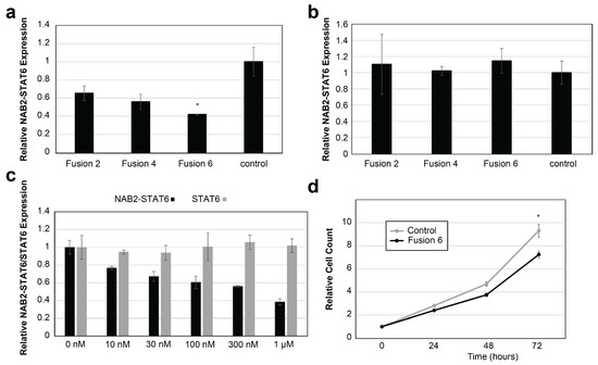 Next, NS-poly cells were treated with Fusion6 ASO using RNAiMAX at different dosages (0 nm, 10 nm, 30 nm, 100 nm, 300 nm, and 1 µM). As shown in Figure 3c, while Fusion6 ASO efficiently suppressed the expression of NAB2–STAT6 transcript (primers P21 and P22, IC50: 356.6 nM), no suppression of wild type STAT6 transcript (wild type STAT6-specific primers P23 and P24, Supplementary Table S2) was observed. Lastly, we transfected NS-poly cells with either Fusion6 or the control ASO at 1 µM concentration. As shown in Figure 3d, Fusion6 ASO significantly suppressed the proliferation of NS-poly cells after 72 h (22.1% suppression, p-value < 0.05). Our results indicated that Fusion6 ASO-based RNA targeting can affect both RNA expression and cell proliferation rates in NS-poly cells.