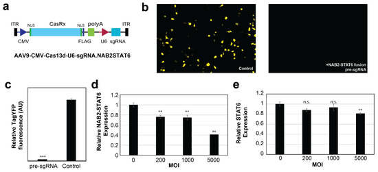 The RfxCas13d (CasRx)-based RNA editing has been reported to be highly efficient in mammalian cells [30,31,32]. Additionally, the presence of a PAM (protospacer adjacent motif) is not required for Cas binding. Thus, for our NAB2 exon6–STAT6 exon17 fusion type, a 30–nt fusion mRNA junction-targeting pre-gRNA sequence was designed (5′-TACCCATCTGTTCAG|CTGCGAGAGGTGGCT-3′, | denotes the break point), and subsequently cloned into a CMV-CasRx-U6-sgRNA.NAB2STAT6 construct (Figure 4a). We first evaluated its editing efficacies using a YFP (Yellow Fluorescent Protein) reporter construct, which contained the corresponding target site after the start codon ATG. As shown in Figure 4b,c, upon delivery into HCT116 cells, this CasRx–pre-sgRNA complex potently suppressed the expression of YFP by 97% (p-value < 0.001), compared to a negative control (NC) sgRNA which targets the human AAVS1 locus (5′-ACCCAGAACCAGAGCCACATTAACCGGCCC-3′).