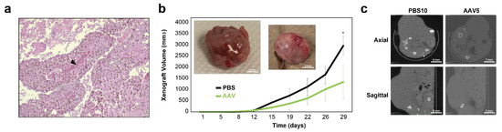 To evaluate whether AAV2-mediated NAB2–STAT6 fusion-targeting CasRx system could exert in vivo therapeutic benefits for SFTs, we first created a subcutaneous (subQ) NS-poly xenograft model using 5 million NS-poly cells and Foxn1nu athymic nude mice (The Jackson Laboratory). As an example, 5 weeks post-injection, one xenograft measured ~2.3 cm3, which was then harvested for preparation of paraffin sections (10 µm). Subsequent Hematoxylin and eosin (H and E) staining showed both necrotic core and neovascular blood vessels within the mass (Figure 5a).