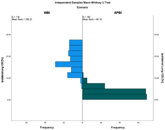 Regarding the ipsilateral lung OAR doses, the results of all eight evaluated dose values were significantly lower with APBI compared to WBI (see Table 2). For example, the ipsilateral mean lung dose (MLD) with APBI was only 47% of that of WBI (4.3 ± 1.4 Gy vs. 9.2 ± 2.5 Gy, p = 0.000), and the V20 was about six times lower (3.0 ± 2.0% vs. 17.9 ± 4.9%, p = 0.000), respectively. The ipsilateral V20 reduction by the use of APBI compared to WBI is illustrated in Figure 1. The side-specific comparison showed similar effects among the patients with either left- or right-sided cancers. In addition, no differences were found for the six evaluated dose values of the contralateral lung. The contralateral MLD was ≤0.7 Gy in each scenario. The total lung OAR values were quite comparable to the results of the ipsilateral lung; every single comparison showed a favorable dose distribution for APBI patients, both in left- and right-sided breast cancers.