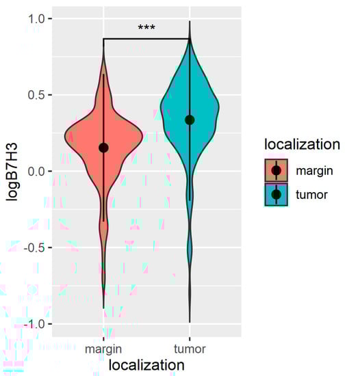 To weigh and homogenize examined tumour and surgical margin tissue, we have followed our previous research papers’ homogenization protocol [,]. We conducted an enzyme-linked immunosorbent assay (ELISA) to determine the concentration of the B7H3 protein. The B7H3 levels were measured using a human B7H3 ELISA kit (Cloud Clone, Wuhan, China), as per the manufacturer’s manual, with a sensitivity of 0.118 ng/mL. The absorbance of the samples was measured at a wavelength of 450 nm using a Universal Microplate Spectrophotometer (μQUANT, Biotek Inc., Winooski, VT, USA). The results were recalculated to correspond to the total protein level and demonstrated as ng/mg of protein.