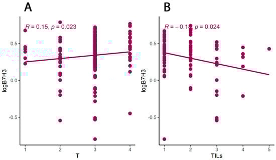 Furthermore, the B7H3 levels in tumour tissue homogenates correlated positively with the T parameter and were negatively associated with the TILs score (Figure 2).